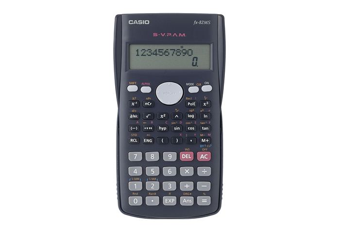 Kalkulator sekolah standar dengan layar dua baris dan desain yang ergonomis.